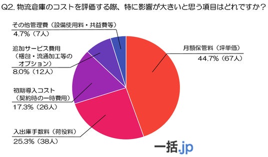 - 最も多かったのは「月額保管料(坪単価)」で、全体の44.7%(67人)が選択しています。倉庫コストの中でも毎月発生する保管料の負担感が最も大きく、コスト管理の上で最優先されている実態が読み取れます。