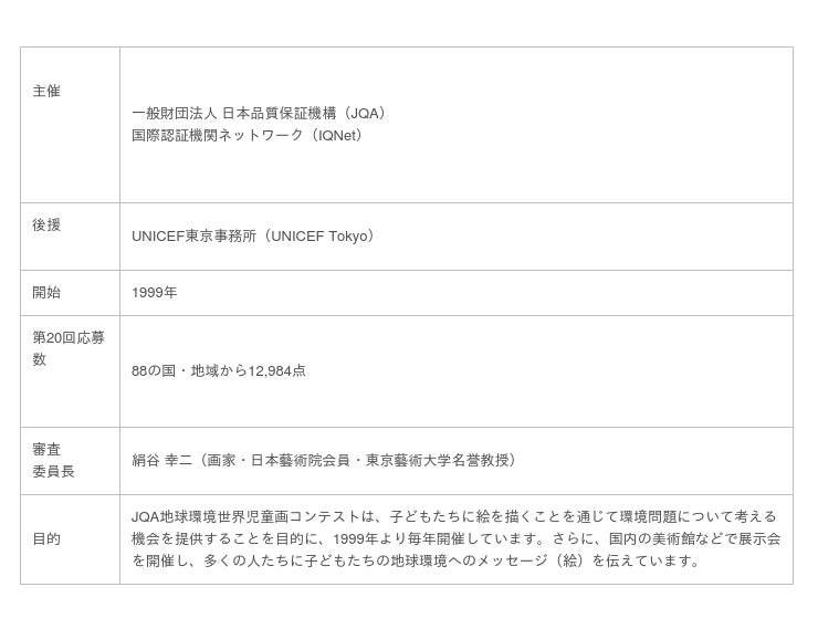 一般財団法人 日本品質保証機構(東京都千代田区、理事長:小林 憲明、略称:JQA)と国際認証機関ネットワーク(スイス・ジュネーブ、略称:IQNet)が主催し、UNICEF東京事務所(東京都渋谷区)の後援による「JQA地球環境世界児童画コンテスト」は、1999年より開催しており、現在21回目の作品を募集しています。