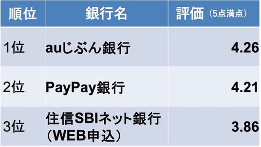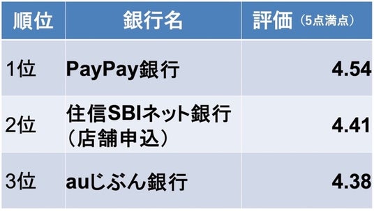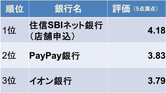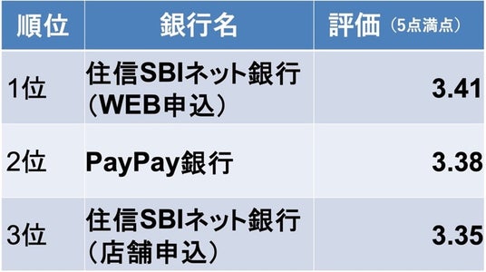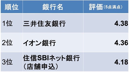 三井住友銀行が1位となりました。「対応が素晴らしかった。」「丁寧でわかりやすかった」など満足度の高い声が多かったです。2位のイオン銀行と3位の住信SBIネット銀行(店舗申込)はいずれも店舗対応を活かした案内が評価された結果と思われます。