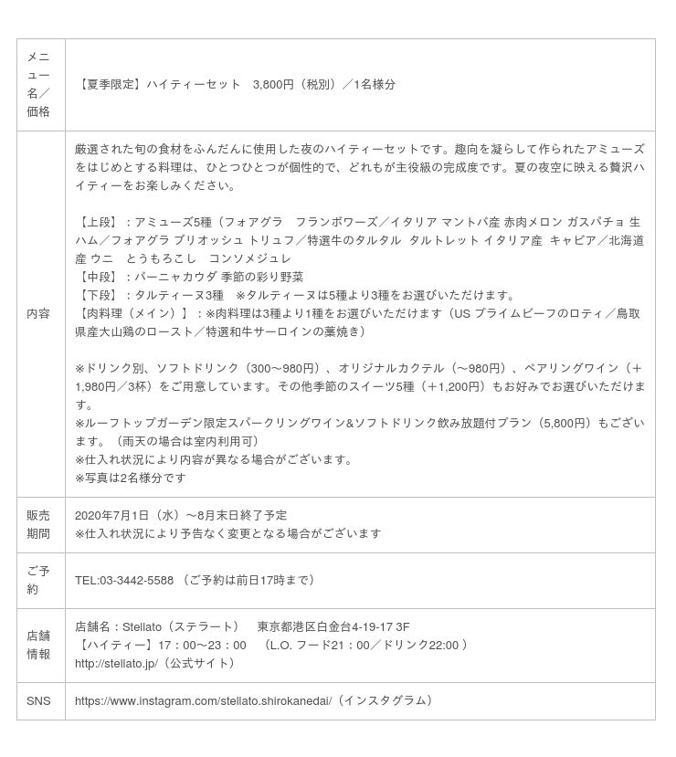 株式会社グローバルダイニングは、白金台「ステラート」にて、夏季限定のハイティーを7月1日(水)より提供開始いたします。