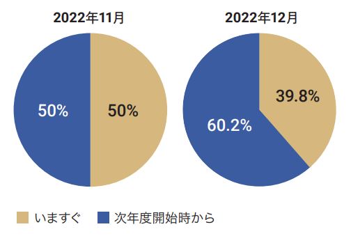 保育士バンク!の利用実績をもとに、当月の園の募集要件で、入職する タイミングが「いますぐ」なのか「次年度開始時」なのかの割合を算出、 前月と比較。