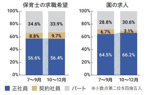 *2022年10~12月保育士バンク!の利用実績をもとに、直近3か月の保育士求職者の希望と園の募集要件で、正社員・契約社員・パートの雇用形態の割合を算出、 前期間と比較。