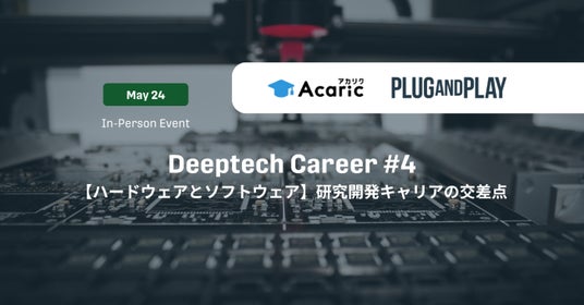 大学院生や研究者のキャリア支援に特化した事業を15年以上にわたって続けている株式会社アカリク(本社:東京都渋谷区、代表取締役社長:山田諒、以下 アカリク)は、Plug and Play Japan株式会社(本社:東京都渋谷区、代表取締役社長 :ヴィンセント・フィリップ、以下 Plug and Play Japan)と共催で「Deeptech Career #4 【ハードウェアとソフトウェア】研究開発キャリアの交差点」を、2024年5月24日(金)にPlug and Play Japan本社にて開催いたしますので、お知らせいたします。
