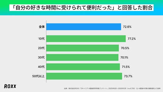 利便性への支持については、すべての年代において70%以上が肯定的に回答しました。企業と候補者がリアルタイムで時間を合わせる必要のない「非同期面接」の合理性が、ライフスタイルや就業状況を問わず広く受容されていることが確認されました。