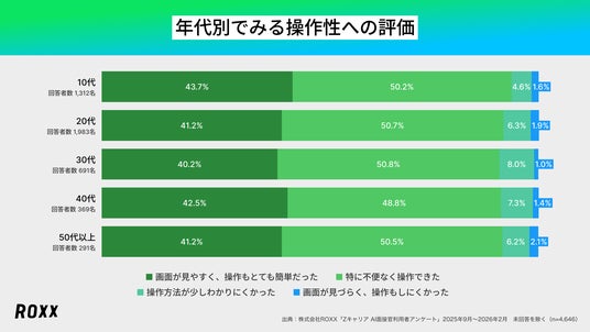 - 全世代で90%以上が操作性を支持。直感的なUIにより公平な選考機会を実現10代から60代以上の全年齢層において、90%以上が操作性を肯定的に評価しました。デバイスやIT習熟度に依存しない直感的なユーザーインターフェース(UI)により、属性を問わない公正な選考機会が提供されていることが裏付けられました。
