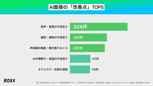 なお、「対面・人間の面接の方が良い」という本質的なAI面接への抵抗感は17件(1.2%)にとどまっており、改善要望の大半はAI面接を否定するものではなく、品質向上への期待として解釈できます。