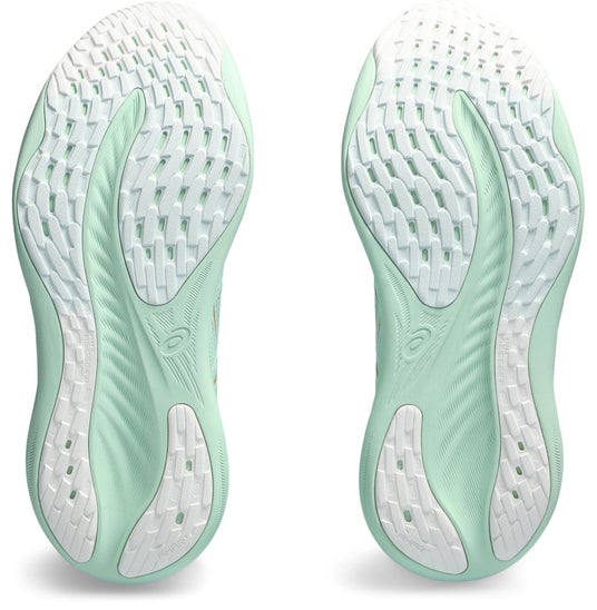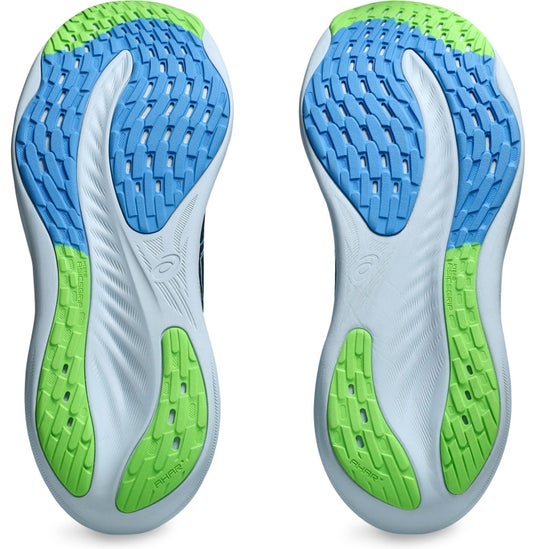 靴底は、独自開発のラバー素材2種類を配した「HYBRID ASICSGRIP(ハイブリッドアシックスグリップ)」を採用し、グリップ力と耐久性を両立させています。中部に、さまざまな路面コンディションでも優れたグリップ力を発揮する「ASICSGRIP(アシックスグリップ)」を使用し、着地や蹴り出し時に力のかかりやすいつま先部とかかと部には当社従来ラバーと比較し約3倍の耐摩耗性をもつ「AHARPLUS(エーハープラス)」を採用しています。
