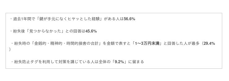 調査の結果、普段持ち歩く鍵の平均本数は2本(35.8%)が最多、次いで1本(30.8%)となり、紛失経験については過去1年間に手元に無くヒヤッとしたという回答が56.6%、うち45.6%の人がそのまま見つからなかった経験があると回答しました。