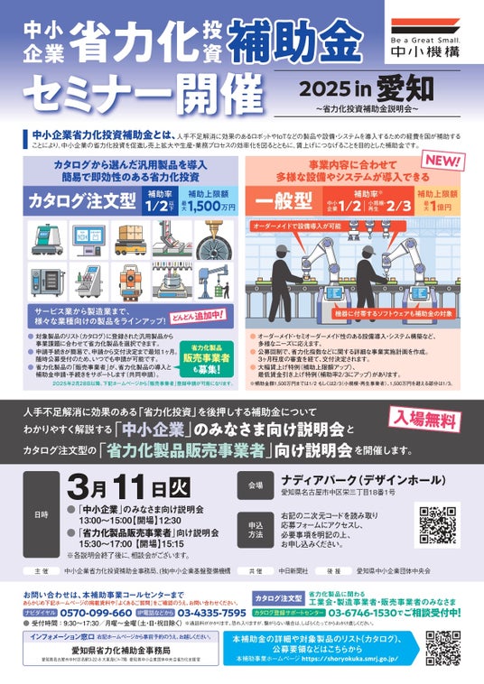 2025年3月から省力化製品の販売事業者のみなさまに、より活用しやすく制度が改善されることになりました。中小企業の人手不足解消に効果のある「省力化投資」を後押しする補助金についてわかりやすく解説する「中小企業」のみなさま向け説明会とカタログ型注文型の「省力化製品販売事業者」向け説明会を開催します。