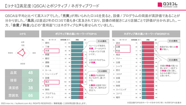 QSCAは平均と比べて高スコアでした。「充実」が用いられた口コミを見ると、設備 / プログラムの両面が高評価であることが分かりました。「風呂」は直近2年の口コミで最も多く言及されており、設備の綺麗さにより店舗ごとで評価が分かれました。