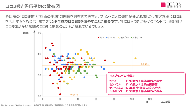 各店舗の”口コミ数”と”評価の平均”の関係を散布図で表すと、ブランドごとに傾向が分かれました。集客施策に口コミを活用するためには、まずブランド全体で口コミ数を増やすことが重要です。特にばらつきが多いブランドは、高評価 / 口コミ数が多い店舗の口コミに施策のヒントが隠れているでしょう。