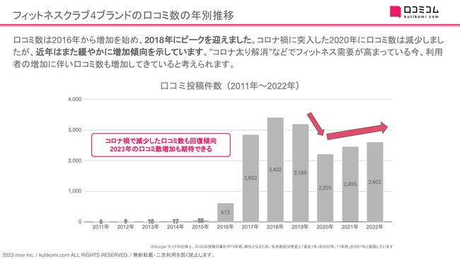 口コミ数は2016年から増加を始め、2018年にピークを迎えました。コロナ禍に突入した2020年に口コミ数は減少しましたが、近年はまた緩やかに増加傾向を示しています。”コロナ太り解消”などでフィットネス需要が高まっている今、利用者の増加に伴い口コミ数も増加してきていると考えられます。