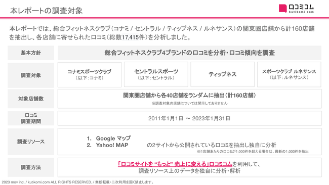 本レポートでは、総合フィットネスクラブ4ブランド(コナミ / セントラル / ティップネス / ルネサンス)の口コミ(総数17,415件)を分析しました。