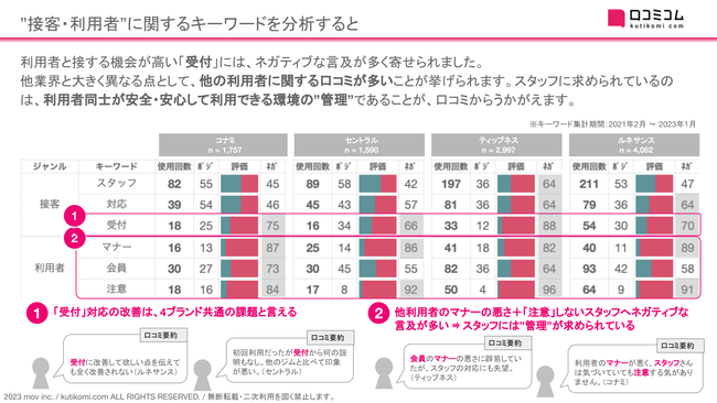 また、他業界と大きく異なる点として、他の利用者のマナーに関する口コミが多いことが挙げられます。スタッフに求められているのは、利用者同士が安全・安心して利用できる環境の”管理”であることが、口コミからうかがえます。