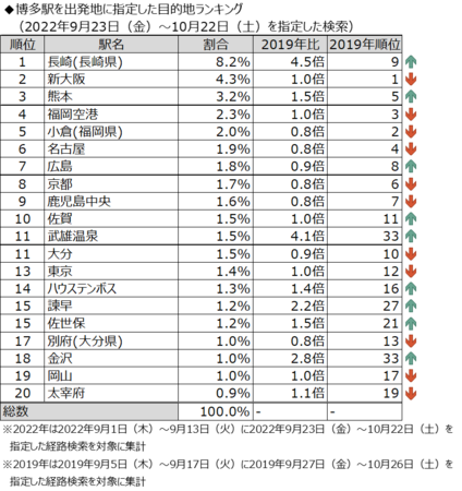 上記の調査対象を基に、博多駅を出発駅とした際の「目的駅」の検索結果を集計しました。