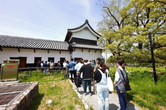 当日は大変気持ちの良い晴天となりました。午前10時、当社の運営する食事付き学生マンションの新入居者より、参加希望のあった45名が「(伝)潮見櫓・下之橋御門」前に集合しました。史跡整備活用課の職員様より挨拶と当日の予定についての説明のあと、建物へと移動します。