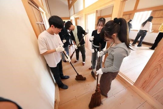 建物内では職員の方より、建物の歴史などの詳細と掃除の仕方について説明があり、作業を開始しました。2班に分かれ、それぞれの建物を担当します。ほうきや雑巾で床の汚れを取り、はたきで窓や壁の埃を落としていきます。建物の外では、周辺の雑草の抜き取り作業を行いました。参加者同士で出身地や学校のことなど、会話を交わしながら楽しそうに作業にあたっていきます。約40分間の作業を経て、随分と綺麗になりました。