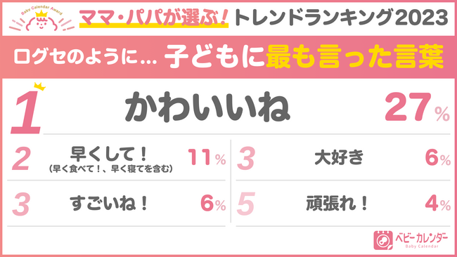 「子どもに最も言った言葉」は「かわいいね」がトップに。愛情表現や応援の言葉が上位を占める中で、「早くして!」が2位にランクイン。ママ・パパの忙しい日常が垣間見えるようです。6位以下には、「ママだよー」「生まれてきてくれてありがとう」「ごはん食べて」という声かけも。ランキングから愛情たっぷりに育てている姿が見えました。