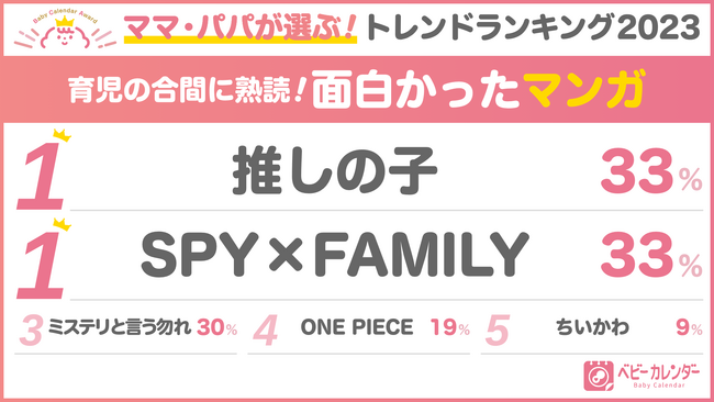 「面白かったマンガ」は、TVアニメ化されている『推しの子』と『SPY×FAMILY』が同率1位に。TVアニメはお子さんと一緒に楽しんでいるママ・パパも多いのではないでしょうか。親子で一緒に楽しめるものがあると話題も広がっていいですよね。