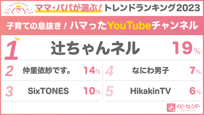 1位「辻ちゃんネル」と2位「仲里依紗です。」は子育ての参考に、3位「SixTONES」と4位「なにわ男子」は推し活でもあり、ママの癒やしになっている模様。5位「HikakinTV」や10位以内に入っている「Fischer‘s」などは子どもと一緒に見ているママ・パパが多そうです。“子育ての参考”、“推し活”、“子どもとの時間”でチャンネルを分け、それぞれ楽しんでいる様子をうかがえました。