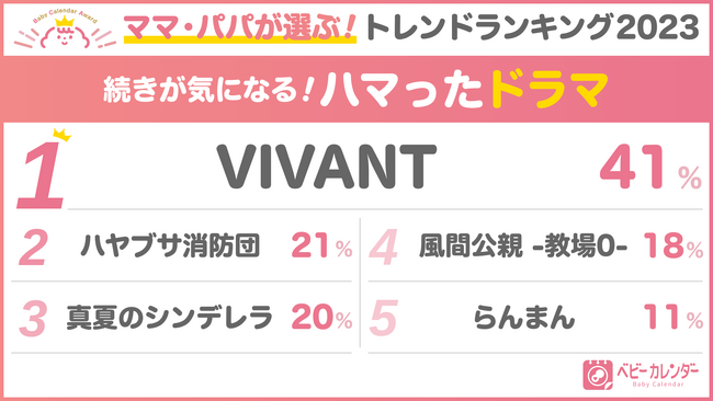 「ハマったドラマ」は、高視聴率を記録した『VIVANT』が断トツのトップ。2位以下も高視聴率のドラマが占めました。10位以内にはNetflixで配信されている韓国ドラマ『ザ・グローリー ~輝かしき復讐~』がランクイン。配信後の視聴ランキングでは1位に輝くこともあり、子育ての合間の楽しみにするママも多かったのではないでしょうか。