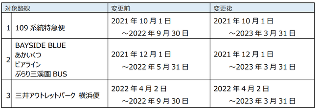 一方、新型コロナウイルス感染症によるまん延防止等重点措置の影響などにより、観光4路線(対象路線2)では当初想定していたお客様のご利用が充分に得られず、想定課題に対する検証を行いにくい状況が続いておりました。そこで、運行間もない三井アウトレットパーク 横浜便を対象に含めて実証実験期間を延長し、検証を継続することと致しました。