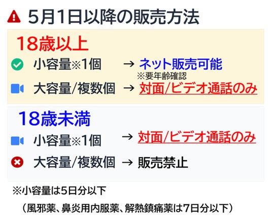 大容量製品や小容量複数個の販売にはビデオ通話が義務付けられることから、ご家族の分や常備薬として、5日分または7日分以上の風邪薬等をネットで購入することが難しくなる可能性があります。