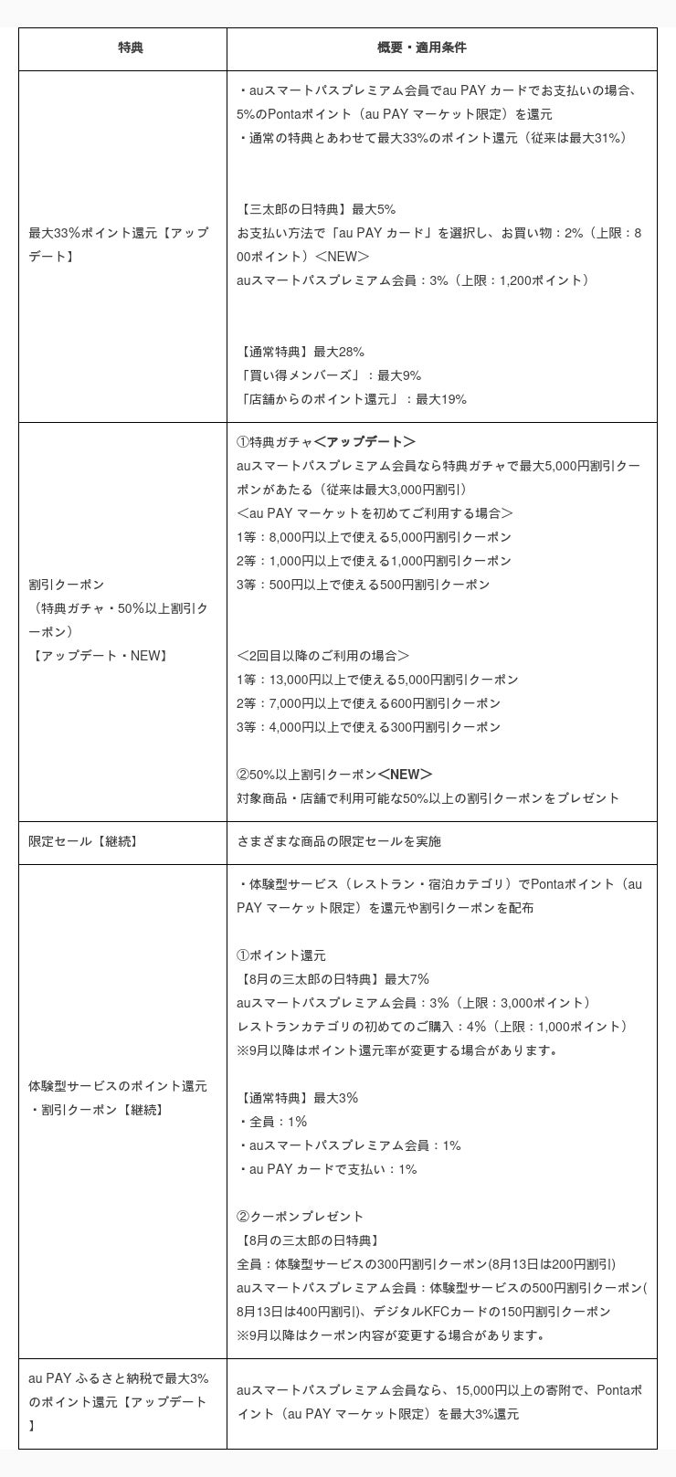 リニューアルしたau PAY マーケットの「三太郎の日」特典は、au PAY マーケットのご利用時、au PAY カードでのお支払いなどの条件達成で最大33%ポイント還元のほか、最大5,000円割引クーポン、50%以上の割引クーポンなどを提供します。さらに、レストランなどの体験型サービスのご利用でポイント還元やおトクな割引クーポン、au PAY ふるさと納税の最大3%ポイント還元など、おトクな特典をご用意し、日々のお買い物をおトクにお楽しみいただけます。