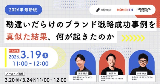 株式会社エフェクチュアル(本社:東京都港区、代表取締役:田中倫明)は、事業成長とブランド戦略の関係をテーマとしたオンラインウェビナー 「2026年最新版 ブランド戦略は、成功事例を真似ても上手くいかない?~ 実践企業に学ぶ、ブランド構築と守り方 ~」 を2026年3月19日(木)に開催いたします。参加費は無料です。本セミナーでは、株式会社マテリアルデジタル、株式会社エブリーと共に、売上拡大の過程で企業が直面するブランド戦略の意思決定について、当事者と第三者双方の視点から解説します。