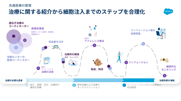 SalesforceのAdvanced Therapy Managementは、医療機関、製造委託先、物流業者、製薬会社の一連の業務をシームレスに統合し、単一のデジタルプラットフォーム上で、製薬会社が複雑なプロセスを管理し、個別化治療を患者さんに提供できるようにします。
