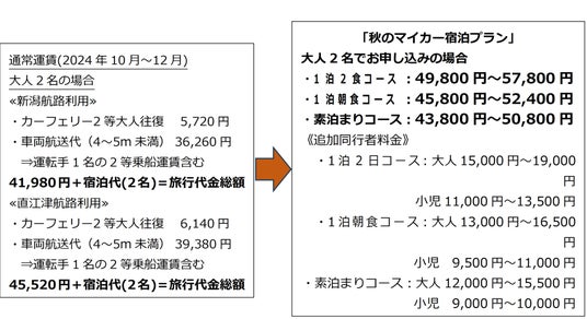 佐渡汽船株式会社は、期間限定でおトクな旅行プラン「秋のマイカー宿泊プラン」を発売いたします。