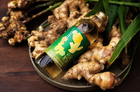 「GINGER SQUEEZE(ジンジャースクイーズ)」は、収穫したばかりの生姜をまるかじりしたような清涼感とみずみずしさに、キリッとした辛味とアクセントに加えた実山椒が、冬にぴったりのオリジナルフレーバーです。生姜に含まれる「ジンゲロール」は、血行促進作用や殺菌作用、体を温める作用があり、寒くなる季節に最適な成分。この「ジンゲロール」の辛みとコンブチャとが絡み合い、発酵が織りなす優しい甘味とトロッとしたテクスチャーを作り出しました。スッキリ、とろり。飲んだ後は身体の奥からじんわりポカポカ。冬の寒さも吹き飛ばす、とっておきのコンブチャをどうぞ。