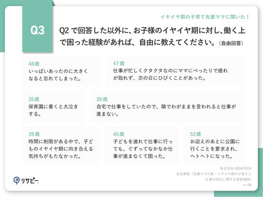 Q2で「わからない/答えられない」以外を回答した方に、「Q3.Q2で回答した以外に、お子様のイヤイヤ期に対し、働く上で困った経験があれば、自由に教えてください。(自由回答)」(n=98)と質問したところ、「仕事が忙しくクタクタなのにママにべったりで疲れが取れず、次の日にひびくことがあった」や「保育園に着くと大泣きする」など49の回答を得ることができました。
