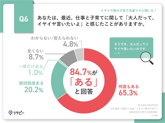 「Q6.あなたは、最近、仕事と子育てに関して「大人だって、イヤイヤ言いたいよ」と感じたことがありますか。」(n=104)と質問したところ、「何度もある」が65.3%、「数回程度ある」が20.2%、「一度だけある」が1.0%という回答となりました。