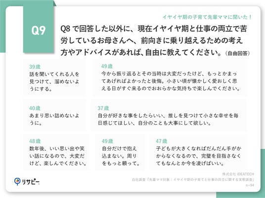 Q9.Q8で回答した以外に、現在イヤイヤ期と仕事の両立で苦労しているお母さんへ、前向きに乗り越えるための考え方やアドバイスがあれば、自由に教えてください。(自由回答)