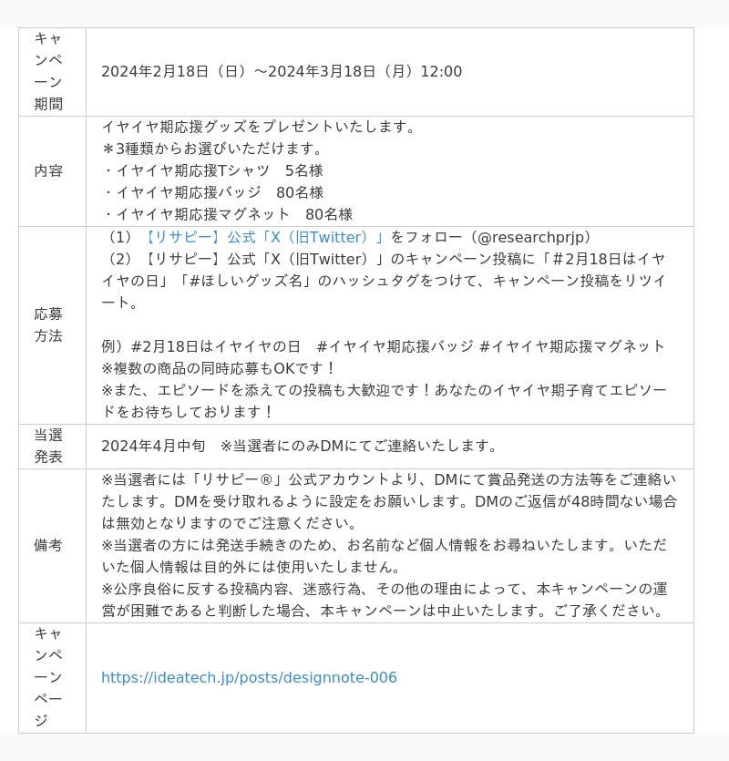 2~3歳は本当に可愛い盛りですが、”魔の2歳”と言われるくらい、対応に苦戦しているパパママさんも多いことでしょう。あれもイヤ、これもイヤ、全部イヤ、あっちがいい、こっちがいい…そこで、IDEATECHは、2月18日「イヤ」が2つで「イヤイヤの日」に合わせ、「イヤイヤ期応援プロジェクト」を始動。日々子育てに奮闘するパパママの皆様を少しでも励ましたいと、イヤイヤ期を楽しく乗り切るための応援グッズを、イヤイヤ期真っ只中の子どもがいるIDEATECHの現役ママが制作しました。「2月18日はイヤイヤの日キャンペーン」では、抽選でイヤイヤ期応援グッズをプレゼントいたします。イヤイヤ期子育て真っ只中の方も、過ぎ去った方も、応援してくださっている方も、社会全体で楽しく子育てを楽しめる風潮を創っていければ幸いです。
