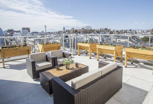 6Fの屋上テラス「ソラ庭」。都会にいながら自然を感じる憩いの場。園芸やヨガ、ペットとの触れ合いなど、様々な活動に用いることができる。