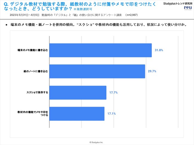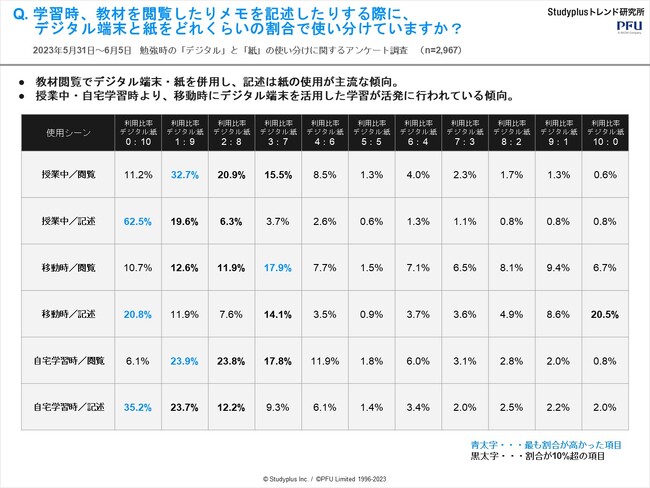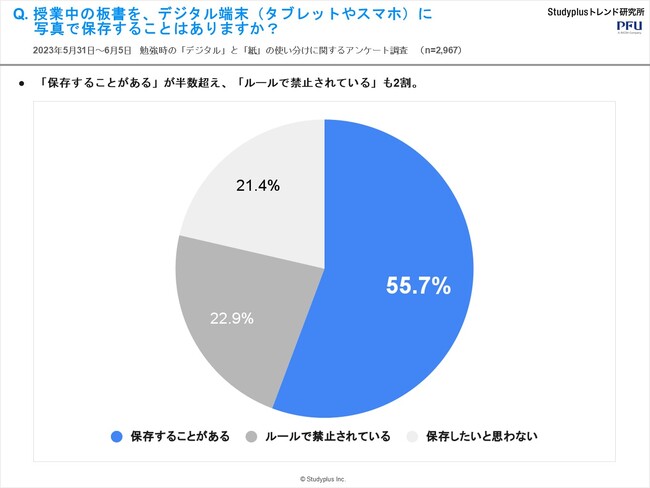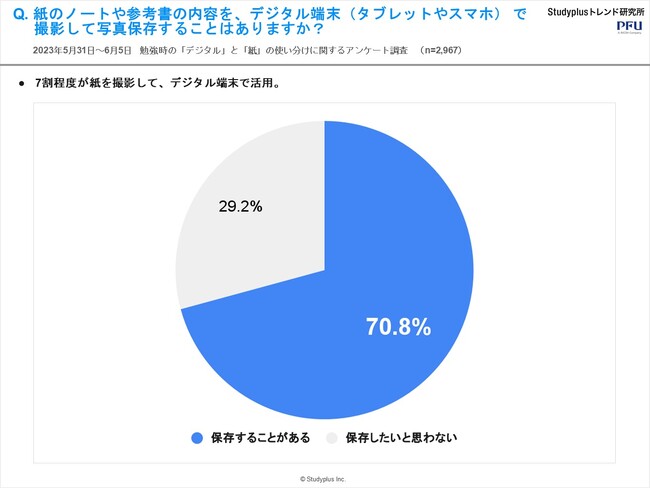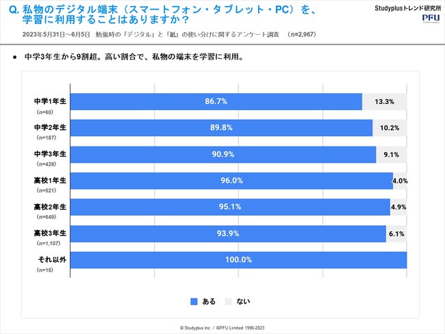 スタディプラス株式会社(本社:東京都千代田区、代表取締役:廣瀬高志、以下スタディプラス)のStudyplusトレンド研究所は、イメージスキャナー「ScanSnap」を提供する株式会社PFU(代表取締役社長:村上清治、以下PFU)と共同で、2023年5月31日(水)から6月5日(月)にかけて学習管理アプリ「Studyplus」上で、中高生2,967名を対象に『勉強時の「デジタル」と「紙」の使い分けに関するアンケート調査』を実施、結果をまとめましたのでご報告いたします。