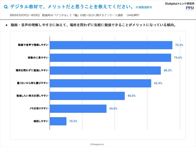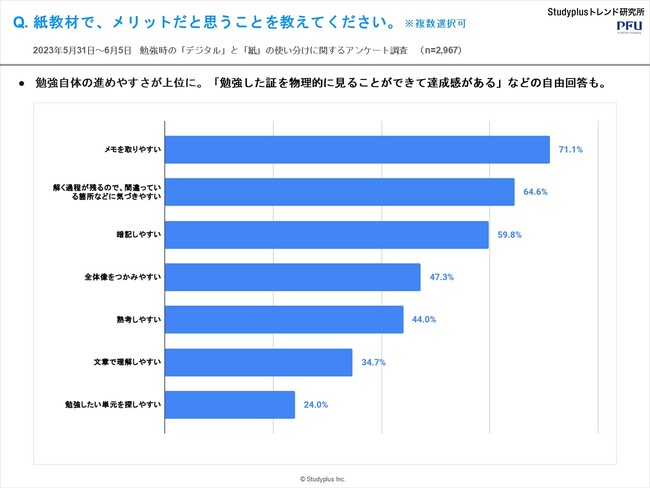 ・メリットとしては、勉強自体の進めやすさが上位。「勉強した証を物理的に見ることができて達成感がある」などの自由回答も。