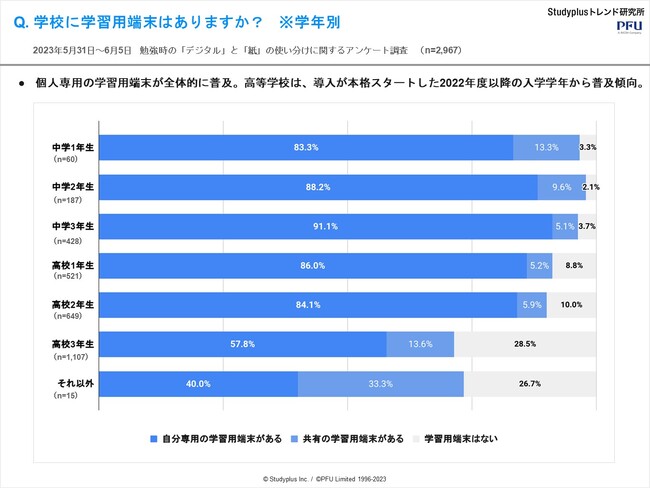 ・学校では、個人専用の学習用端末が全体的に普及していることがわかる。高等学校では、導入が本格化した2022年度以降の入学学年から普及傾向。高校1年生・高校2年生では8割を超えている。