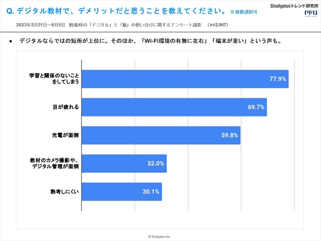 ・「学校と関係のないことをしてしまう」「目が疲れる」「充電が面倒」といったデジタルならではの短所が上位に。そのほか、「Wi-Fi環境の有無に左右」「端末が重い」という声も。
