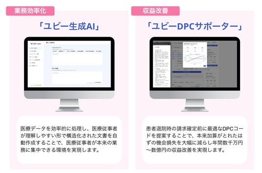 医療機関におけるDX推進を支援するため、『補助金活用サポート付き「ユビー生成AI」「ユビーDPCサポーター」特別パッケージ』を提供しております。本パッケージは、政府の令和7年度補正予算案に盛り込まれている事業等を踏まえ、病院機能やエリア等の支給要件に応じた各種補助金の活用サポート付きで、「ユビー生成AI」と「ユビーDPCサポーター」の導入支援を行うものです。今後も医療現場の課題解決に貢献できるよう、引き続きご支援を強化してまいります。
