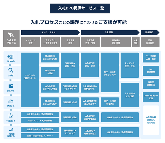 その中で、導入企業において「人手不足により、煩雑な入札関連業務がまわらない」「必要なデータの抽出や分析に時間を要している」「自社に関連する入札案件をしっかりと見極め、効率よく入札に参加し、落札率を高めたい」などといった、潜在的な入札プロセスのニーズがあることがわかりました。自社の強みや業界に応じた入札戦略策定や効率よく応札し落札率を向上するためには、従来のSaaS(WEBサービス)の導入のみならず、一定の入札関連ノウハウを活用した人力作業が不可欠であることから、この度、新たに「入札BPO」の提供を開始いたします。