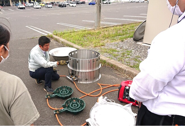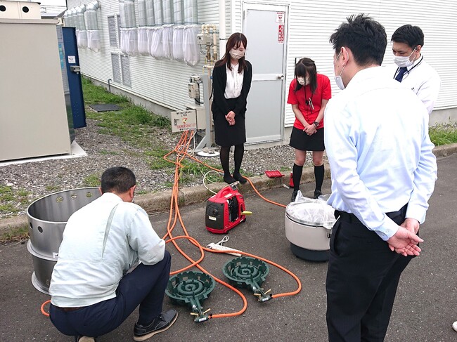 近年、各地で大雨による災害が起き、大規模地震も懸念されている中、万が一災害が発生した場合、速やかに災害支援に努められるよう、両者の社員が合同防災訓練を通じ、LPガスボンベからのガス供給方法、発電機の接続と起動方法の確認、大釜、大鍋、ガスコンロの組み立て研修を行いました。
