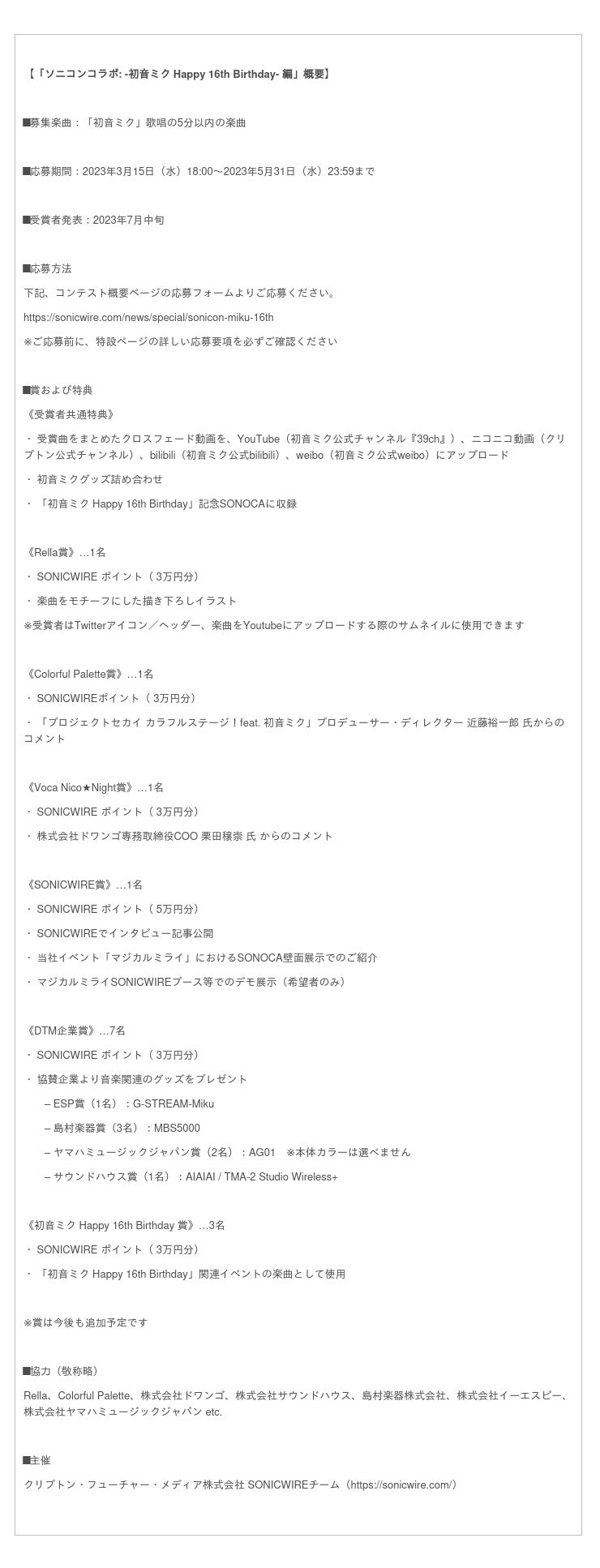 クリプトン・フューチャー・メディア株式会社(本社:北海道札幌市、代表取締役:伊藤博之、以下クリプトン)は、運営するデジタルクリエイター向けダウンロードストア『SONICWIRE(ソニックワイヤ)』が主催するクリエイター応援企画の一環として、楽曲コンテスト「ソニコンコラボ: -初音ミク Happy 16th Birthday- 編」を開催いたします。応募期間は、2023年3月15日18:00(水)~2023年5月31日(水)23:59まで。歌声合成ソフトウェア『初音ミク』を用いた楽曲を募集いたします。5分以内の楽曲であれば、音楽ジャンル・歌詞の言語は不問です。ふるってご応募ください。