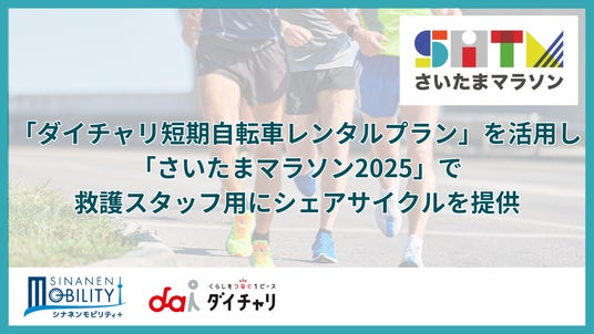 エネルギー・住まい・暮らしの総合サービス事業を展開するシナネンホールディングス株式会社(本社:東京都品川区、代表取締役社長CEO:中込 太郎)の子会社で、移動を楽しく、快適にするシェアサイクル「ダイチャリ」を運営するシナネンモビリティPLUS株式会社(本社:東京都品川区、代表取締役社長:菅原 健)は、3月16日(日)に開催される「さいたまマラソン2025」(主催:さいたま市、一般社団法人さいたまスポーツコミッション、一般財団法人埼玉陸上競技協会)に、「ダイチャリ短期自転車レンタルプラン」(以下 本プラン)の仕組みを活用したシェアサイクルの貸し出しを行い、救護スタッフの移動手段確保に協力いたします。