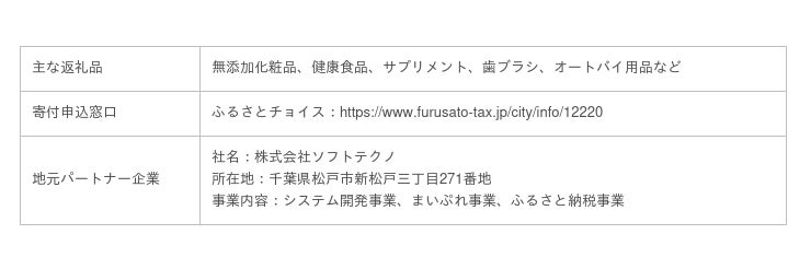 株式会社ソフトテクノは、現在すでに千葉県野田市・松戸市でふるさと納税業務を当社と共同で展開しており、今回の流山市で3エリア目となります。2023年4月1日時点で約10事業者・約40品の返礼品が揃っており、今後も、事業者との「顔の見える関係性」を活かしながら、まだ知られていない魅力ある品を増やし、ふるさと納税を通じて「住みたい・住み続けたい」流山市の都市ブランド醸成に貢献してまいります。