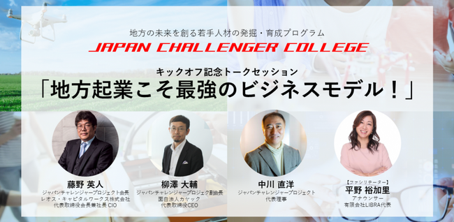 iU(東京都墨田区、学長 中村伊知哉、http://www.i-u.ac.jp)は、日本全国で起業家育成プログラムを展開する公益社団法人ジャパンチャレンジャープロジェクト主催の「JAPAN CHALLENGER COLLEGE」を後援します。本プログラムは、地方の未来を創る若手人材の発掘・育成することを目的に2023年10月から2024年1月にかけて、全国10カ所の地域で開催します。それに先駆けて、9月27日(水)19時より地方で起業する新しい働き方・生き方を提唱する3名をゲストに迎え、「地方起業こそ最強のビジネスモデルだ!」をテーマにしたオンライントークセッションを開催します。