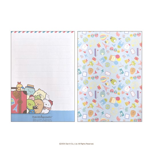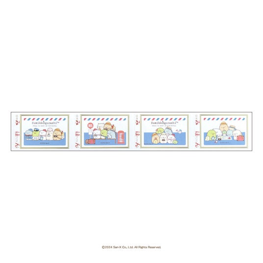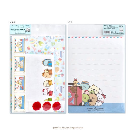 「すみっコ」たちが描かれたフレーム切手(切手デザイン4種)と封筒、便箋、シーリングワックス風シールがセットになった商品です。