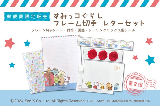 株式会社郵便局物販サービス(東京都江東区、代表取締役社長 荒若 仁)は、『すみっコぐらし』のキャラクターがデザインされた「フレーム切手」「封筒」「便箋」「シーリングワックス風シール」の4アイテムをセットにした『すみっコぐらし フレーム切手セット 第2弾』を、2024年4月22日(月)から一部の郵便局店頭および「郵便局のネットショップ」限定で販売開始します。